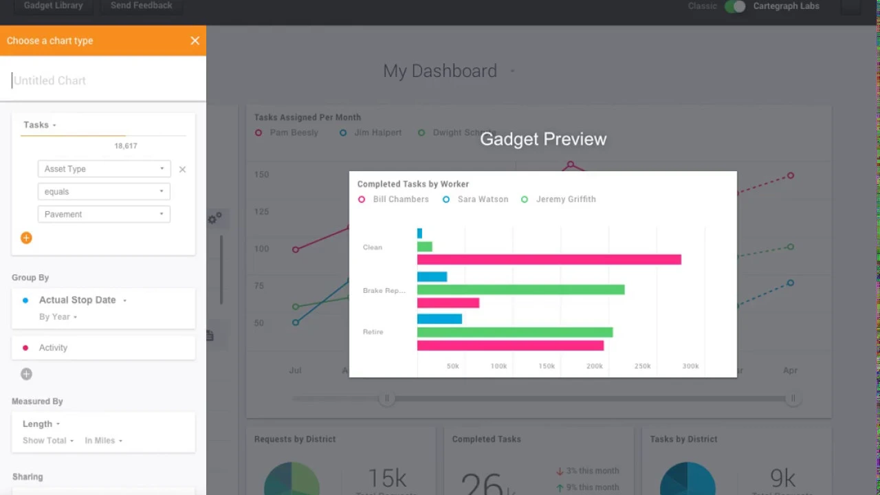 Cartegraph’s Operations Management System (OMS) helps local governments manage assets, assign work, and track resources. The UX team was tasked with creating the next big customer-facing feature. In the end, this feature would be known as the Analytics Dashboard.